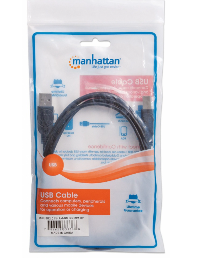 CABLE DE IMPRESORA MANHATTAN USB A B 1.8M VELOCIDAD 2.0 NEGRO 333368